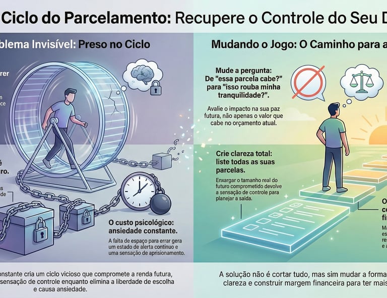 Aprenda a enxergar o parcelamento pelo que ele realmente é: uma antecipação de consumo que sequestra sua liberdade meses antes do dinheiro cair na conta.
